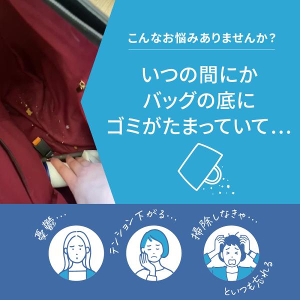 お掃除ボールがカバンやバッグの中をコロコロ転がり、粘着性のある内側の球体があらゆる汚れの粒子を吸着する仕組みです。