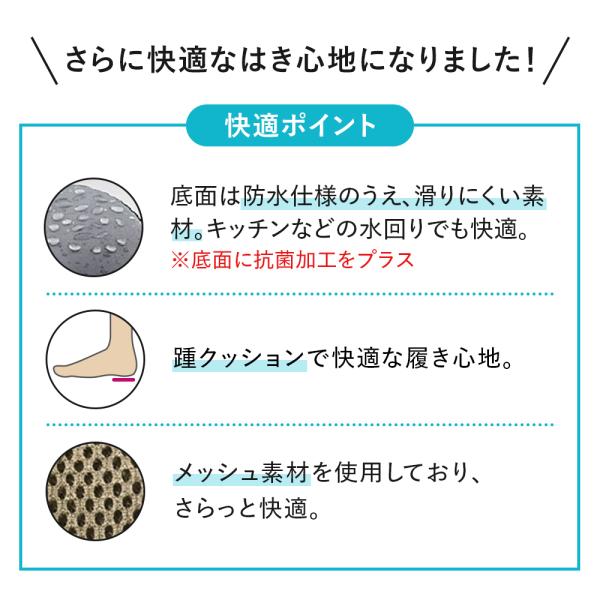 メッシュ素材で通気性がよく、サラッとムレにくい。着脱しやすいフィット感のあるストレッチ素材を使用。足底は防水仕様のすべりにくい素材で、キッチンなどの水まわりでの着用も安心。リニューアルでかかとのクッションの密度、反発力を向上。より快適に。