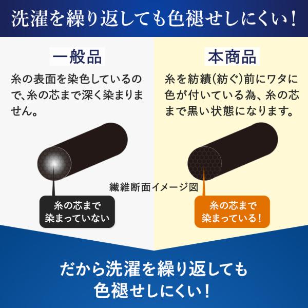 表面を染色した糸を使用している一般品に対し、本商品は糸を紡績(紡ぐ)前にワタに色をつけています。そうすることで糸の芯まで黒く染まった状態になり、一般品に比べ洗濯を繰り返しても色褪せしにくい耐久性を実現しています。