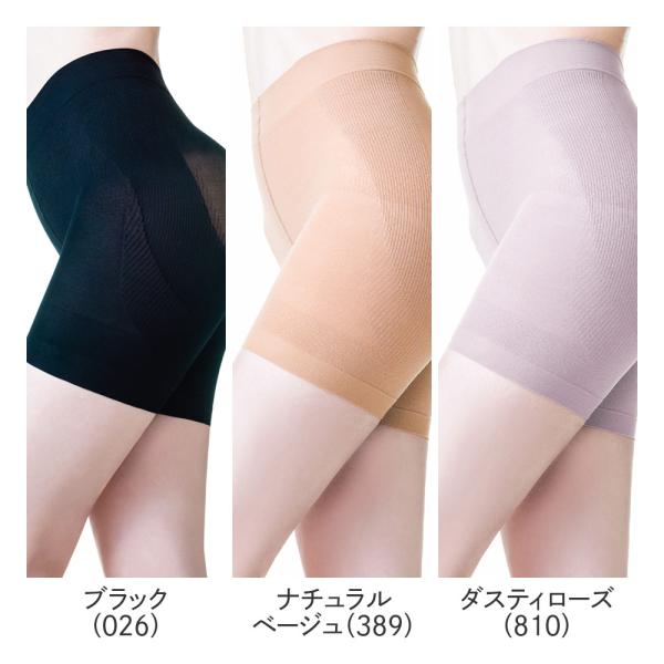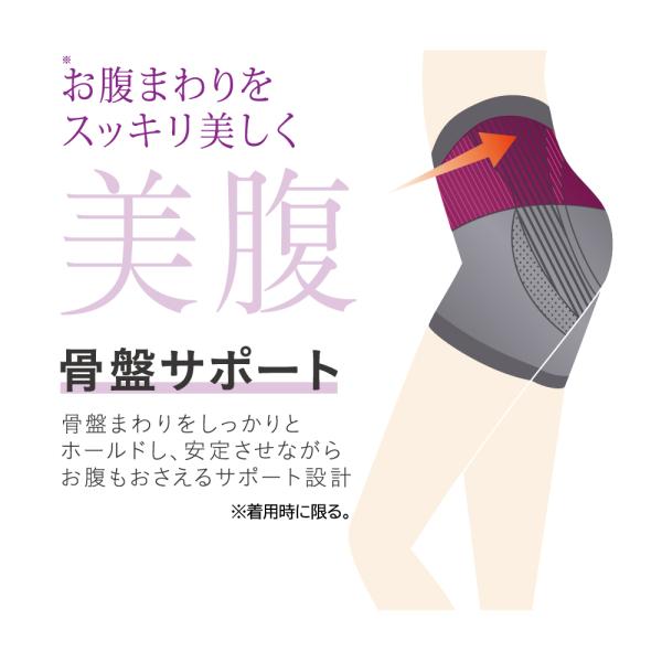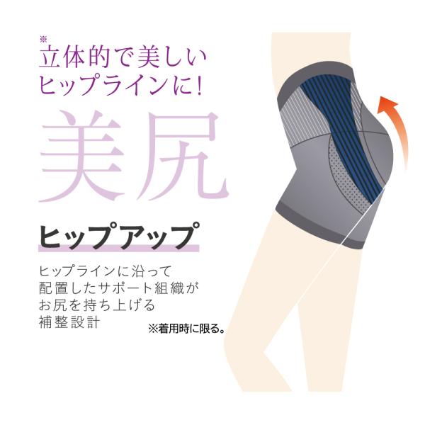 骨盤を安定させながら、ぽっこりお腹もおさえるサポート設計。さらにお尻を下からグッと持ち上げるヒップアップ設計。よく伸びるタイツ素材を使用しているので、しっかり補整しながらも、柔らかく優しいはき心地で、アウターにもひびきにくいです。