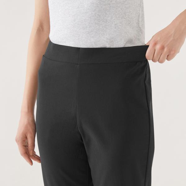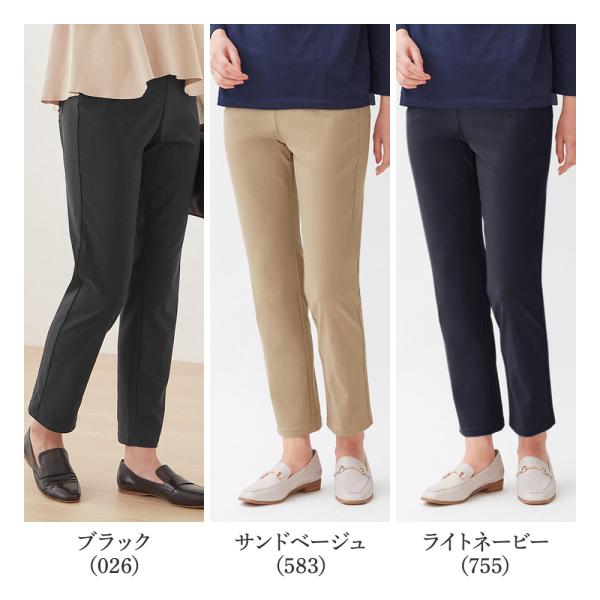 ウエストの後ろ側にリブニットゴムを使用し、ラクなのにフィット。前ウエストはフラットにして、スッキリときれいな見た目に。横ストレッチがしっかりした人気のレーヨン混素材で動きやすい。