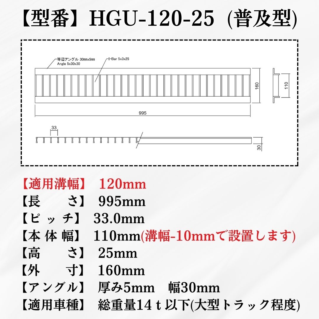 グレーチング U字溝 HGU-120-25 溝幅120mm用 大型トラック荷重 規格 T-14 溝 蓋 側溝 普及型 並目 法山本店