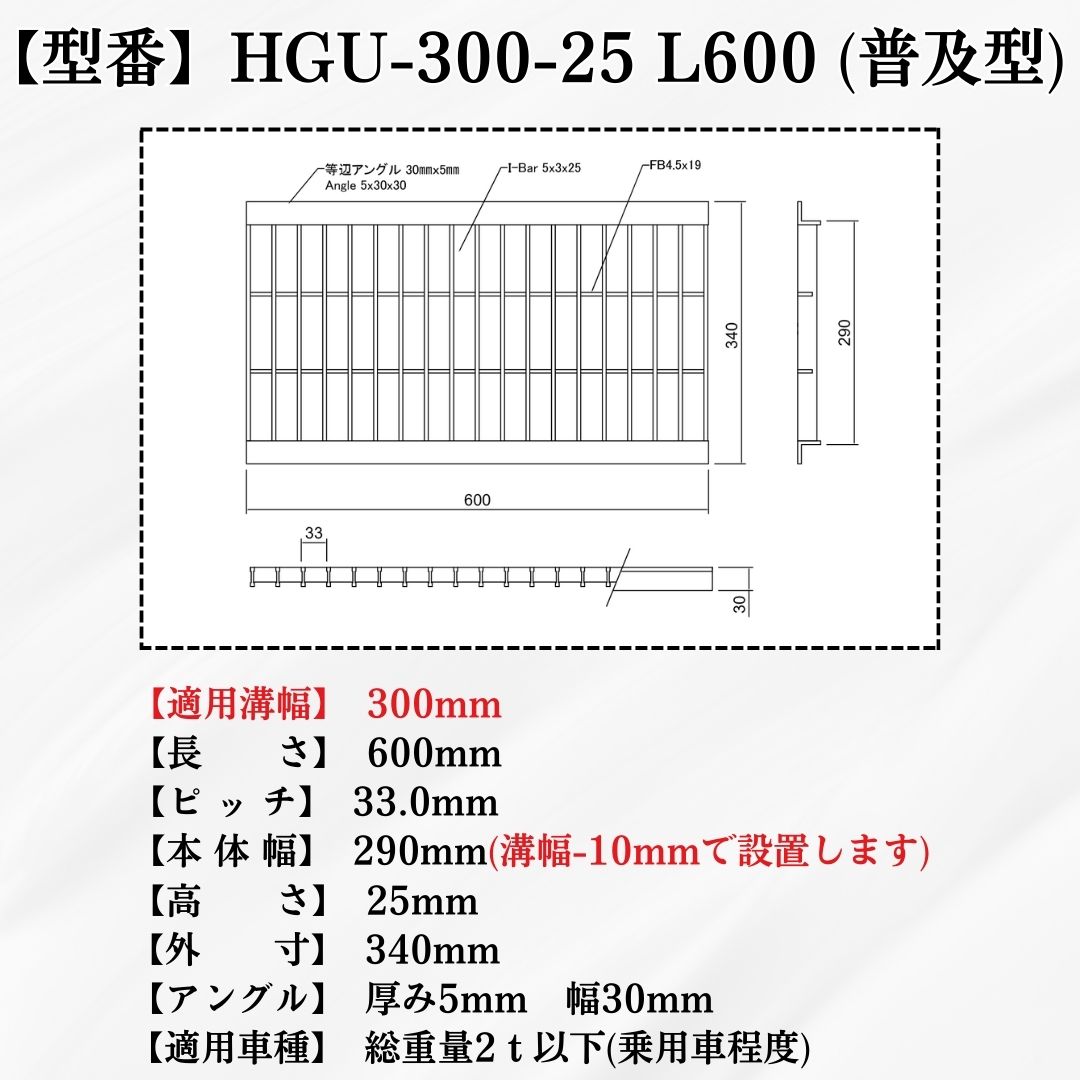 グレーチング U字溝 HGU-300-25L600 溝幅300mm用 乗用車荷重 規格 T-2 溝 蓋 側溝 普及型 並目 L600 法山本店