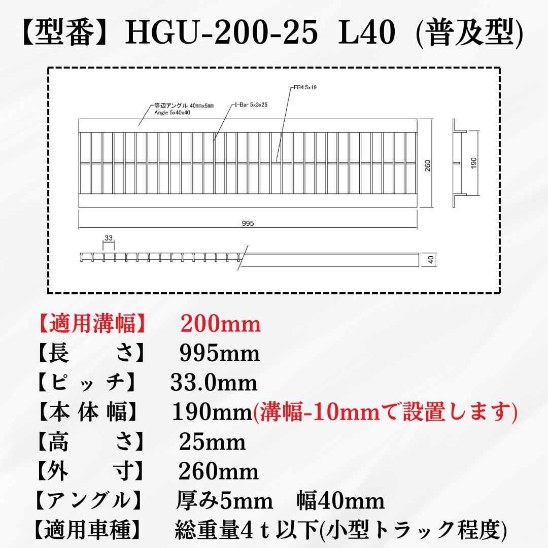 【商品名 U字溝用グレーチング(普及型)HGU-200-25L40】