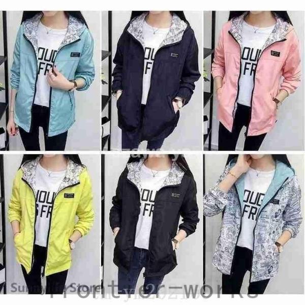 春秋リバーシブルジャンパーマウンテンパーカーナイロンジャケットブルゾンウィンドブレーカー長袖レディーススフード付きライトアウター通学