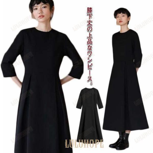 ブラック レディース ポケット付き 8分袖 フォーマル 大人 クルーネック 秋 着〓せ 膝下 喪服 春 ワンピース ロングワンピース 大きいサイズ