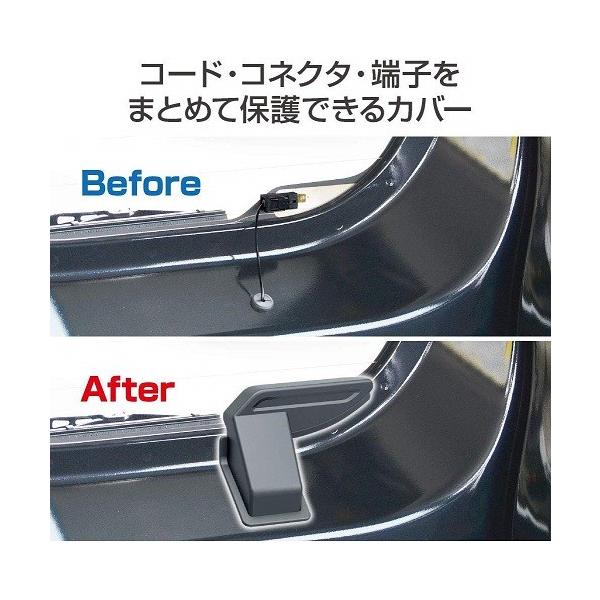 貼付けるだけで、リアデフォッガー(曇り止め)のむき出しになっているコード・コネクタ・端子をまとめて保護できるカバーです