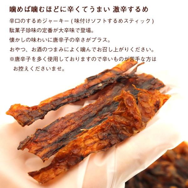 辛口のするめジャーキー (味付けソフトするめスティック) 駄菓子珍味の定番が大辛味で登場。