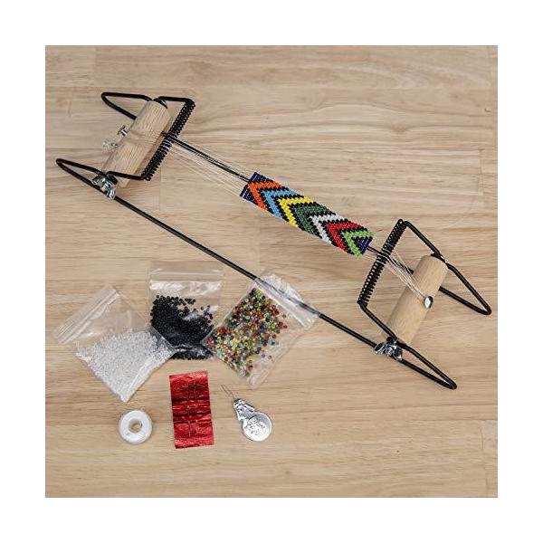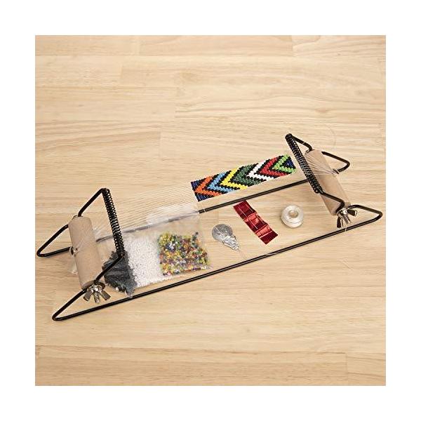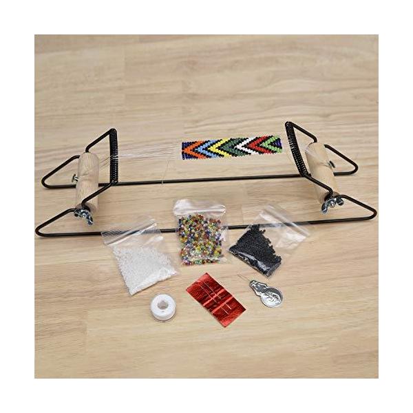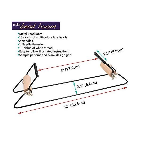 「商品情報」メタルビーズルームキット ルーム(12.5インチ x 2.5インチ x 3インチ)、スレッド、針、18グラムガラスビーズ(ブレスレット、ネックレス、ベルトなど)。「主な仕様」ビーズルームキット 金属
