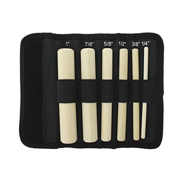 セットには、コンパクトなラベル付き収納ケースに入った丸木マンドレル6個が含まれます。