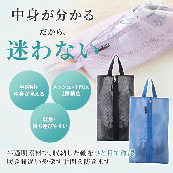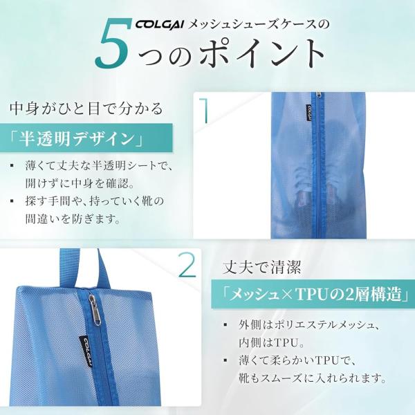 COLGAI メッシュシューズケース「主な仕様」?【中身がひと目で分かる半透明デザイン】薄くて丈夫な半透明シートを採用。開けずに中身を確認でき、履き間違いや探す手間を防ぎます。ジムや旅行時にもスムーズに取り出せます。