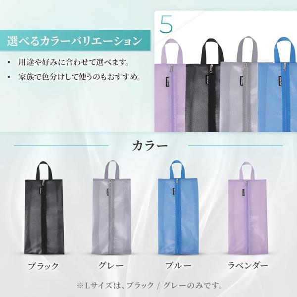 ?【選べる2サイズ&カラーバリエーション】 Mサイズ・Lサイズの2サイズ展開。用途や靴の大きさに合わせて選べます。ブラック/グレー/ブルー/ラベンダー(※Lサイズはブラック・グレーのみ)。家族で色分けして使う