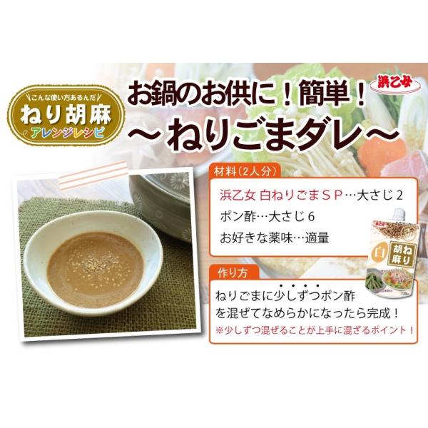 ●浜乙女独自の製法で風味良く仕上げた白ねりごまを、使いやすいスパウトパウチタイプにしました。