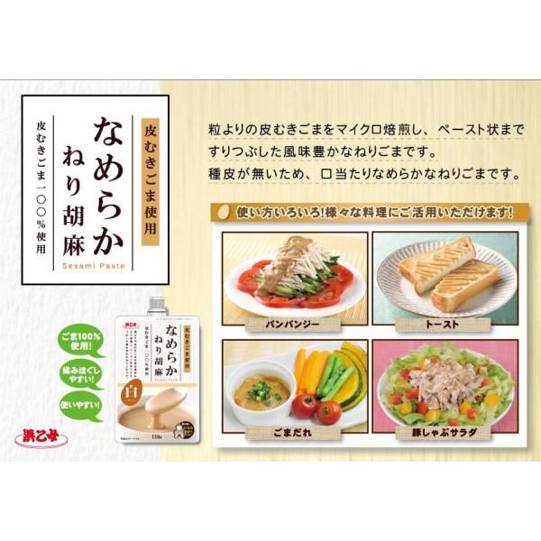 ●粒よりの皮むきごまをマイクロ焙煎し、ペースト状まですりつぶした風味豊かなねりごまです。種皮がないため、口当たりが非常になめらかです。