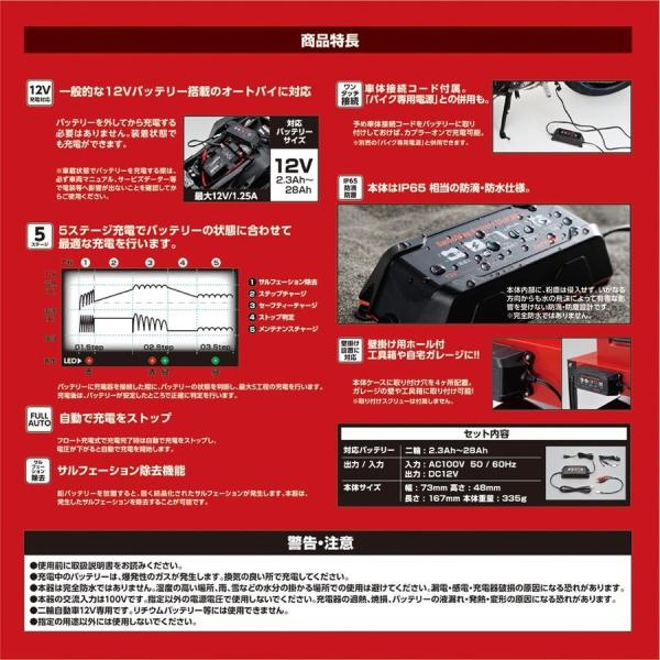 【適合】汎用 【商品説明】 ●12Vバッテリー搭載車専用品。バッテリーの状態を判断し、最大5ステージの充電で最適な充電を行ないます。 ●充電を自動でストップする機能とサルフェーション除去機能付き。 ●本体は、IP65相当の防滴・防塵仕様です。 ●旧品(76079)と比べ、充電プログラムの最適化、シンプルでわかりやすい表示、ボディサイズをコンパクトにブラッシュアップしました。 ●・対応バッテリー容量/二輪自動車2.3Ah〜28Ah ●・対応バッテリー種類/二輪自動車ベント型バッテリー、シールドバッテリー、VRLAバッテリー、ジェルバッテリー ●入力:AC100V 50 / 60Hz ●出力:DC12V ●カラー:ブラック ●本体重量:335g ●サイズ:幅:73mm×高さ:48mm×長さ:167mm ●二輪自動車バッテリー:2.3Ah〜28Ah ●※使用前に取扱説明書をお読みください。 ●※充電中のバッテリーは、爆発性のガスが発生します。換気の良い所で充電してください。 ●※本器は完全防水ではありません。湿度の高い …※文字数制限により、商品情報が途切れてしまっている場合がございます。詳細についてはお問い合わせください。