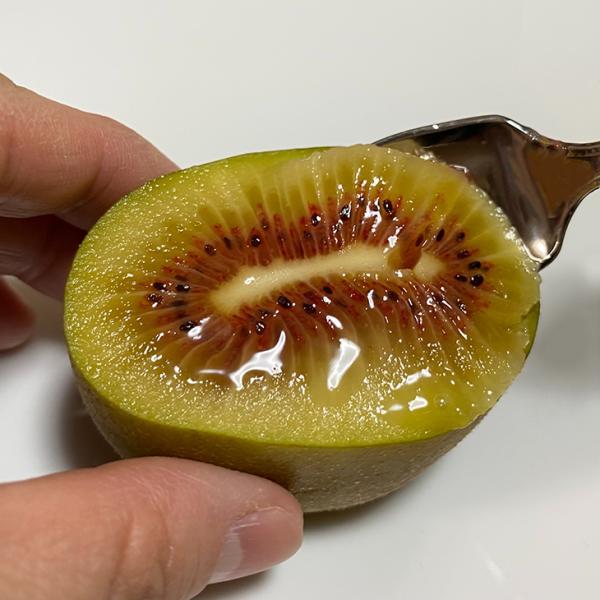 レッドキウイの中で一番大きな実を付ける早生品種です。果実の中は赤く色付いていて糖度が高く、酸味が少ないので甘みが強く感じられます。また、皮の毛も少なく、キウイを食べた後のあのノドのイガイガ感が少ないので、とても食べやすいです。