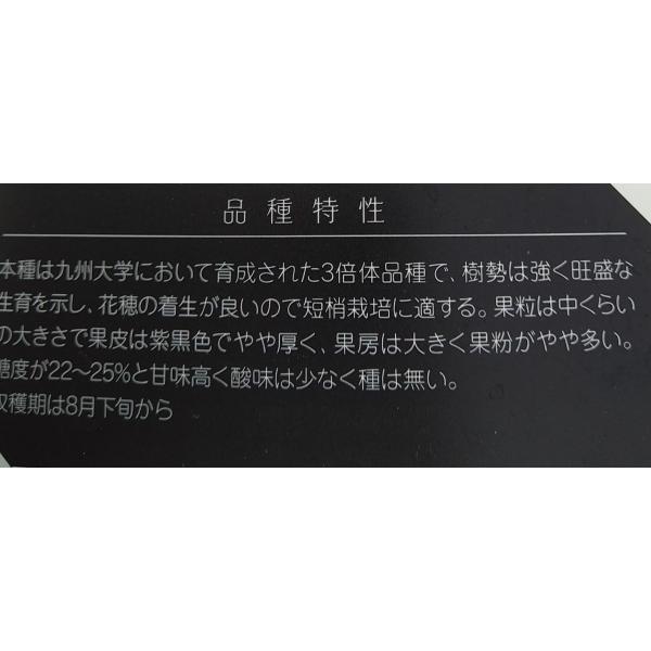 BKシードレスは大粒・種子なしで、皮離れが良いので食べやすいブドウです。糖度20度以上に達し、また肉質はヨーロッパ系のブドウに特有な、噛み切りやすさ(崩壊性)を有しています。 ブドウを種子なしにするための作業が不要で、また摘粒(果粒の密着を防ぐための間引き作業)も必要ありませんので、早期に袋かけ(果実を雨や害虫,農薬の汚れから守るためのもの)をすることができるため、減農薬栽培が可能です。