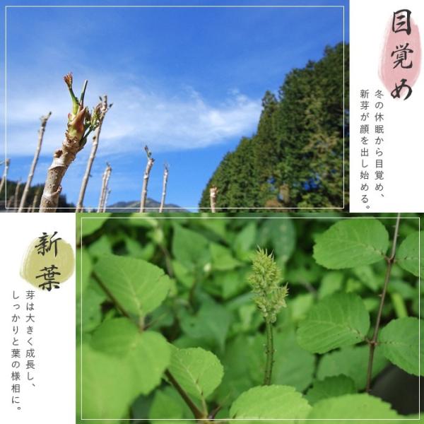 8〜9月には白い小さな花を咲かせ、10月には黒紫色の果実が成ります。枝は立つように伸び、先端には楕円状の葉をつけます。欲張って若芽を収穫しすぎてしまうと、樹が弱って枯れてしまいます。収穫するのは一番芽のみにして、二番芽三番芽は収穫せずに残すようにしましょう。