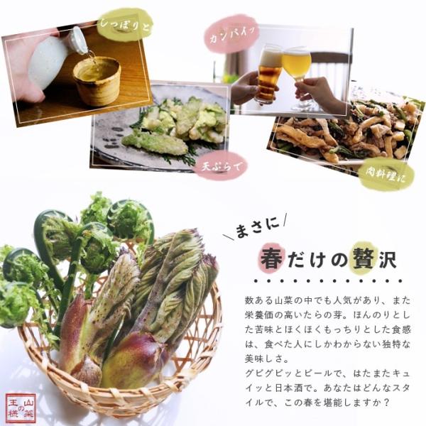 タラの木は、日当たりの良い山野に自生する落葉低木で、春に収穫される若芽は「タラの芽」と言われる山菜です。本来たらの木は、幹の表面や新芽にトゲがありますが、このとげなしタラは、トゲがない (小さくて少ない) 品種で、家庭栽培でも扱いやすいです。たらの芽は山菜の中でもっとも人気で、「山菜の王様」とも呼ばれます。さらにタンパク質やビタミンなども豊富で、栄養価が高いため「山のバター」と称されています。タラノメは、新芽が開ききる前に収穫します。芽が伸び過ぎると、苦みやエグミが強くなります。ほんのりとした苦味に、ほくほくもっちりとした食感。天ぷらやお浸り、炒め物や和え物などにして頂きます。独特な風味で、春だけにしか楽しめない贅沢な味わいです。