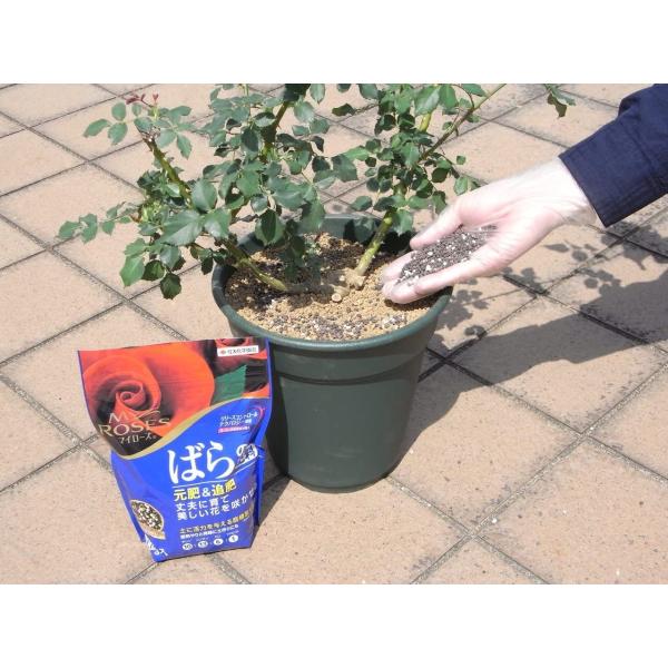 6号鉢に20g、10号鉢であれば70g。地植えであれば1m四方に200gを土に混ぜ込んでおきます。(根に触れても肥料焼けしません)