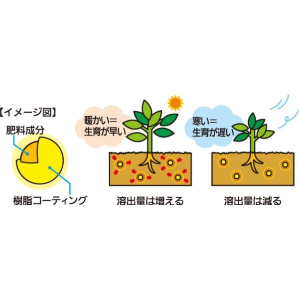 暖かいと肥料成分が速やかに溶出され、寒く生長が鈍い時期は肥料成分の溶出が緩やかになる【リリースコントロールテクノロジー】が採用されている商品です。