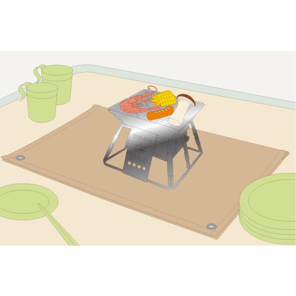 一枚あると便利な、火の粉が直に芝生やウッドデッキに落ちるのを防ぐたき火台シート。耐熱温度約500℃で熱に強く、BBQグリルの下に敷くことで焼けあとや焦げを付きにくくします。卓上グリルの場合は2つ折りにしてテーブルに敷いて使うことが可能。