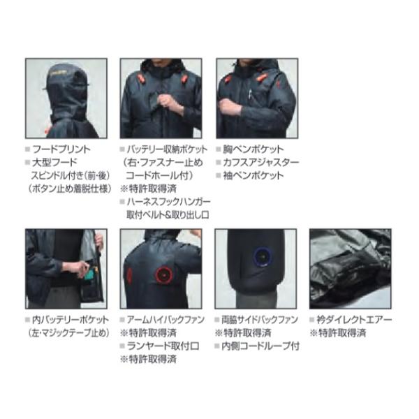 ◎ヘルメット収納フード(着脱可能)、フックハンガー、背ランヤードホールを配備しフルハーネスに完全対応