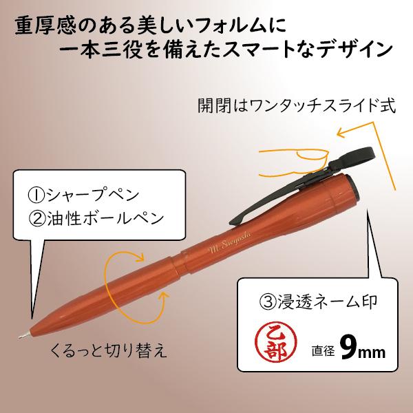 ネーム印部は片手で操作できるキャップレス、筆記部はボールペンとシャープペンが使えます。
