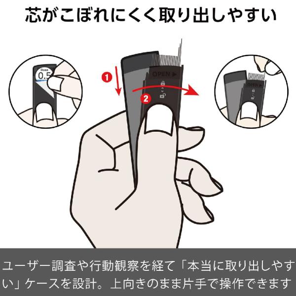 ケースは片手で操作可能で、芯をこぼすリスクを減らし、使いやすさを追求。
