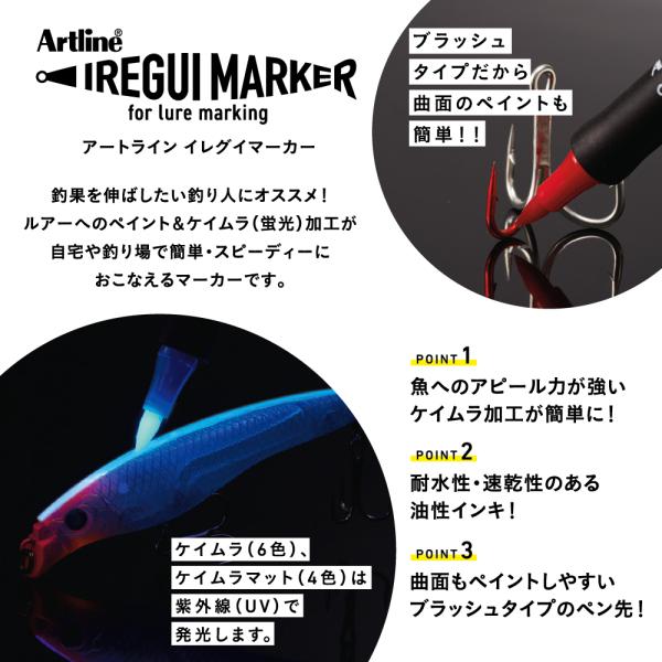 釣果を伸ばしたい釣り人必携のルアーへの着色&ケイムラ加工マーカー「イレグイマーカー」です。