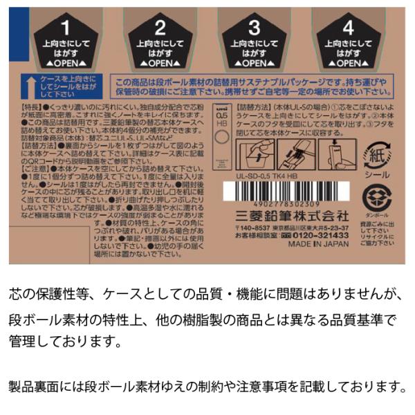 シャープ芯ケース4個分!段ボール素材の詰替用サステナブルパッケージ!空になった本体ケースに、芯を詰め替えて繰り返しお使いいただける「替芯uniUL-SD詰替用」です。
