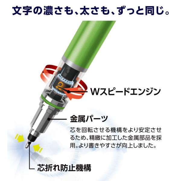 この自動芯回転機構のギアの変更により、HBでは約12%、2Bでは約17%細い描線幅を書き続けることができるようになりました。(0.5mmの同じ芯を使用した場合) 芯が回転しない通常のシャープで芯先が「偏減り」しやすい、字画が少なく1画の線が長い字(カナや英字)でも、均一な描線を書くことができます。