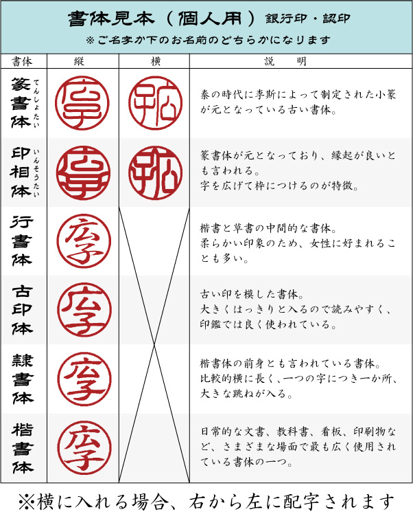 ●書体:篆書体(縦・横)/印相体(縦・横)/行書体/古印体/隷書体/楷書体
