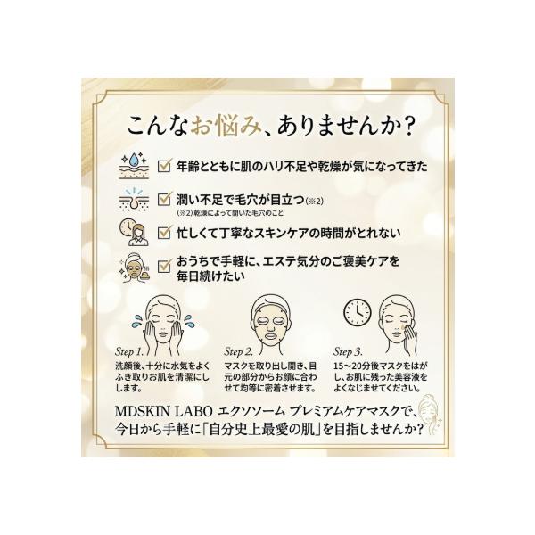MDSKIN LABO エクソソーム プレミアムケアマスク 30枚は、エクソソームや保湿成分を配合した大容量タイプのフェイスマスクです。化粧水、乳液、美容液、パックの4役で使いやすく、乾燥が気になる肌にうるおいを与えてしっとり整えます。毎日のスキンケアに取り入れやすい30枚入りです。