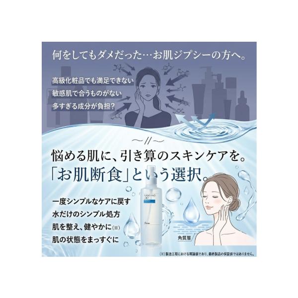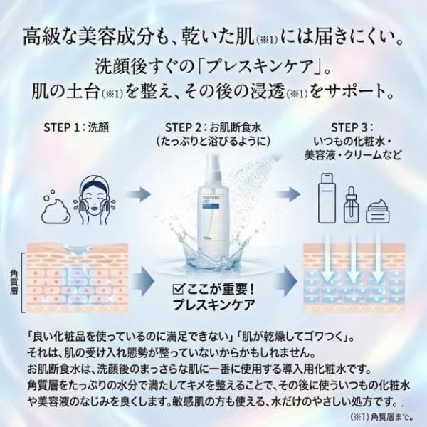 お肌断食水 200ml は、洗顔後の肌に使いやすいプレ化粧水タイプのミスト化粧水です。ナノクラスター水を使用し、防腐剤無添加のシンプル処方でうるおいを与えます。毎日のスキンケア前の保湿やシンプルケアに取り入れやすいお肌断食水ローションです。