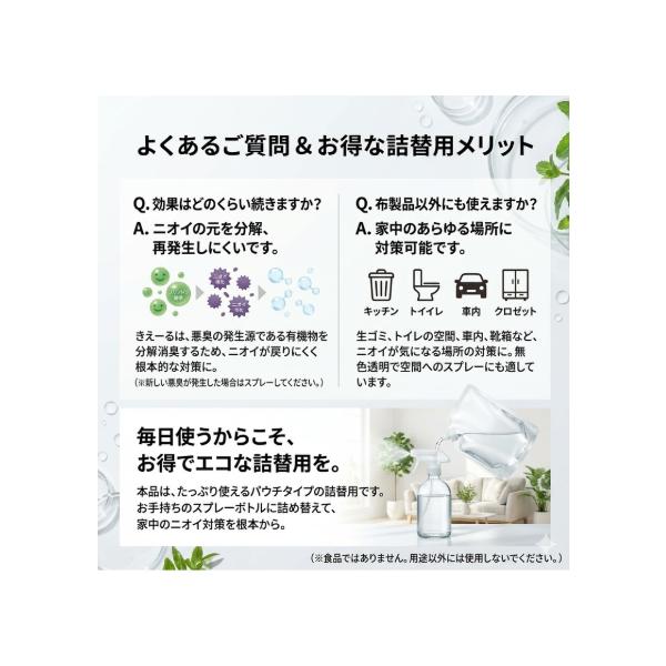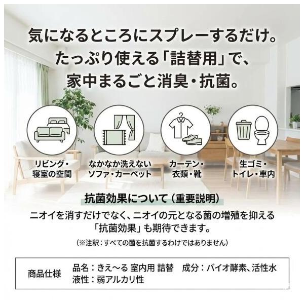 きえーる 室内用 4L。トイレや生ゴミ、タバコ、衣類、靴、ペットまわりなど、家の中のさまざまな生活臭に使いやすい消臭液です。香りでごまかさず、気になるニオイをすっきり消臭できるのが特長。天然成分100%で無香料なので、赤ちゃんやペットのいるご家庭でも使いやすく、毎日の消臭習慣にたっぷり使える大容量タイプです。