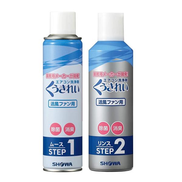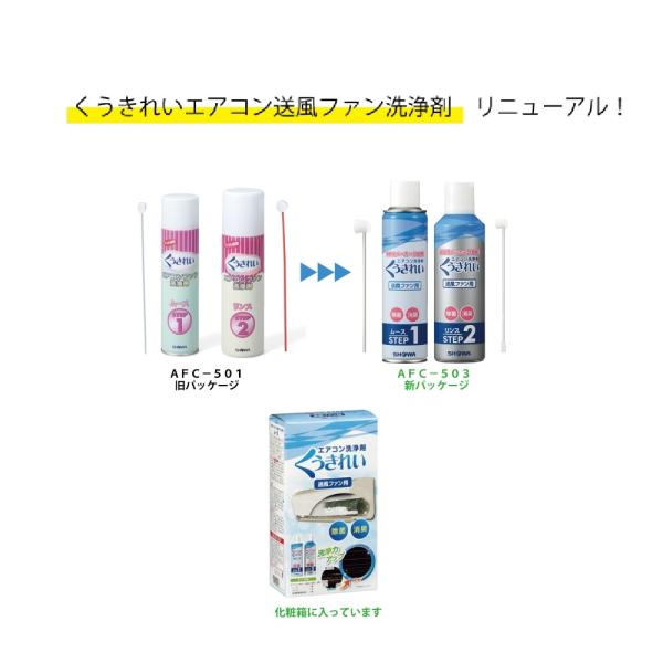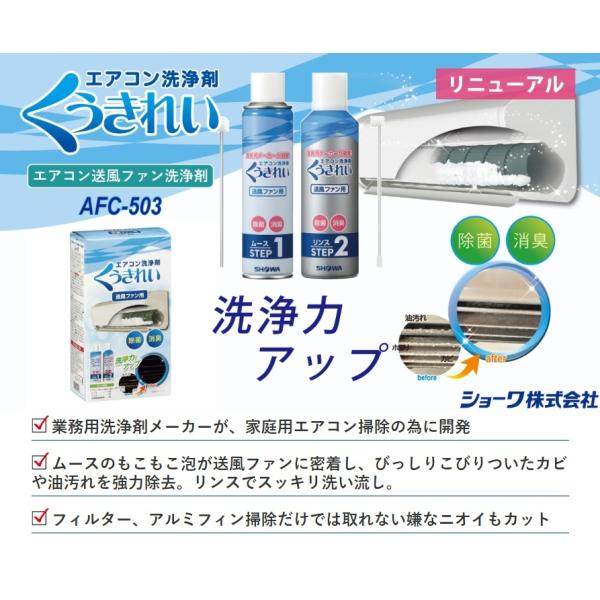 くうきれい AFC-503 エアコン送風ファン洗浄剤 2個セット。エアコンの送風ファンに付着したカビやホコリ、油汚れを泡で密着洗浄できるファン専用クリーナーです。冷房や送風時のニオイが気になる方や、複数台のエアコンをまとめて掃除したい方にぴったり。養生シート付きで、家庭で使いやすい2台分セットです。