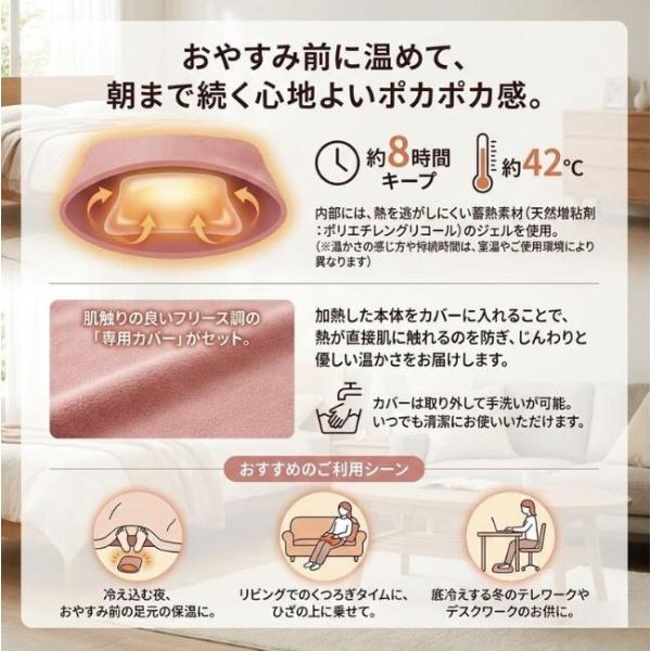 湯たロン 電子レンジ 湯たんぽ。電子レンジで温めるだけで使え、お湯の入れ替え不要で手軽に使える湯たんぽです。約42℃のあたたかさが約8時間続くので、布団の中で足元やお腹まわりをじんわり温めたい方にぴったり。洗える専用カバー付きで、寒い季節の就寝時や冷え対策をラクに続けたい方におすすめです。
