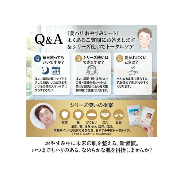 美ハリ おやすみほうれいシート 18枚入は、口元まわりの乾燥が気になる部分に使いやすい就寝用の部分用保湿シートです。アスタキサンチン、コエンザイムQ10、セラミド、ヒアルロン酸などの保湿成分を配合し、口元にうるおいを与えてなめらかに整えます。口元のポイント保湿に取り入れやすい日本製シートです。