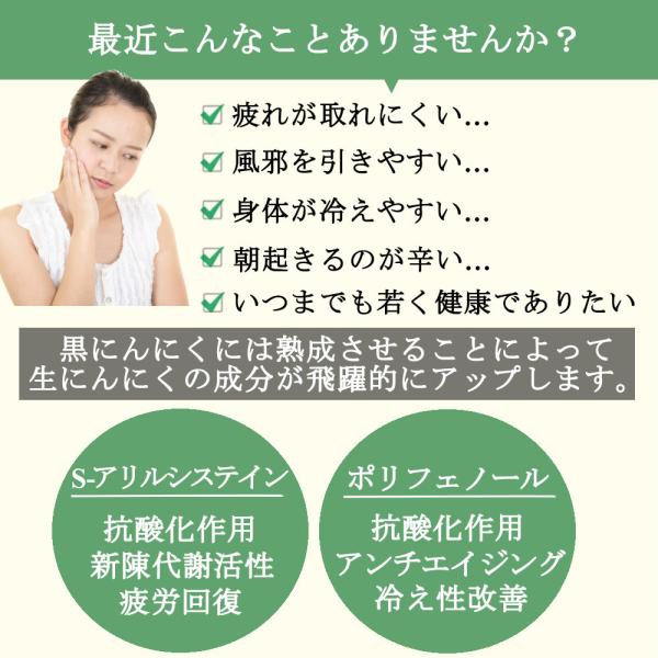 にんにくをじっくり熟成発酵させることにより、抗酸化作用のある「ポリフェノール」や「S-アリルシステイン」、健康維持に欠かせない「アミノ酸」などの有効成分が生にんにくより飛躍的にアップし、滋養強壮や疲労回復に効果的だと言われています。