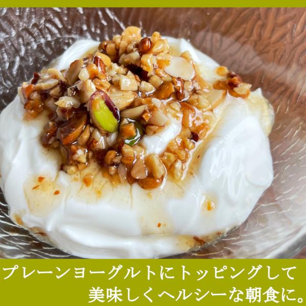 厳選した4種類のナッツ(ピーナッツ、ピスタチオ、ヘーゼルナッツ、杏仁) を食べやすく細かく砕いて、100%純粋のアカシアはちみつに漬け込みました。 ナッツがぎっしり詰まって、惜しみなく使えるたっぷり400gサイズです。