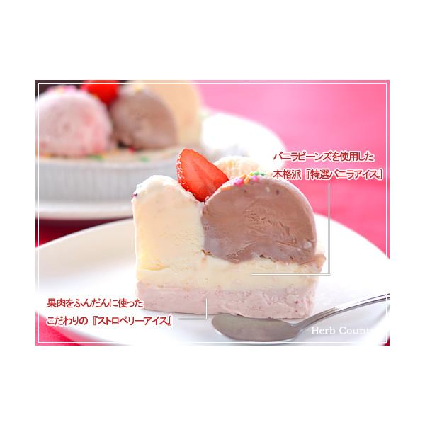 土台はストロベリーとバニラアイスが2層にサンドされ、上部のトッピングアイスはチョコレート、ストロベリー、バニラアイスが盛り付けられております。
