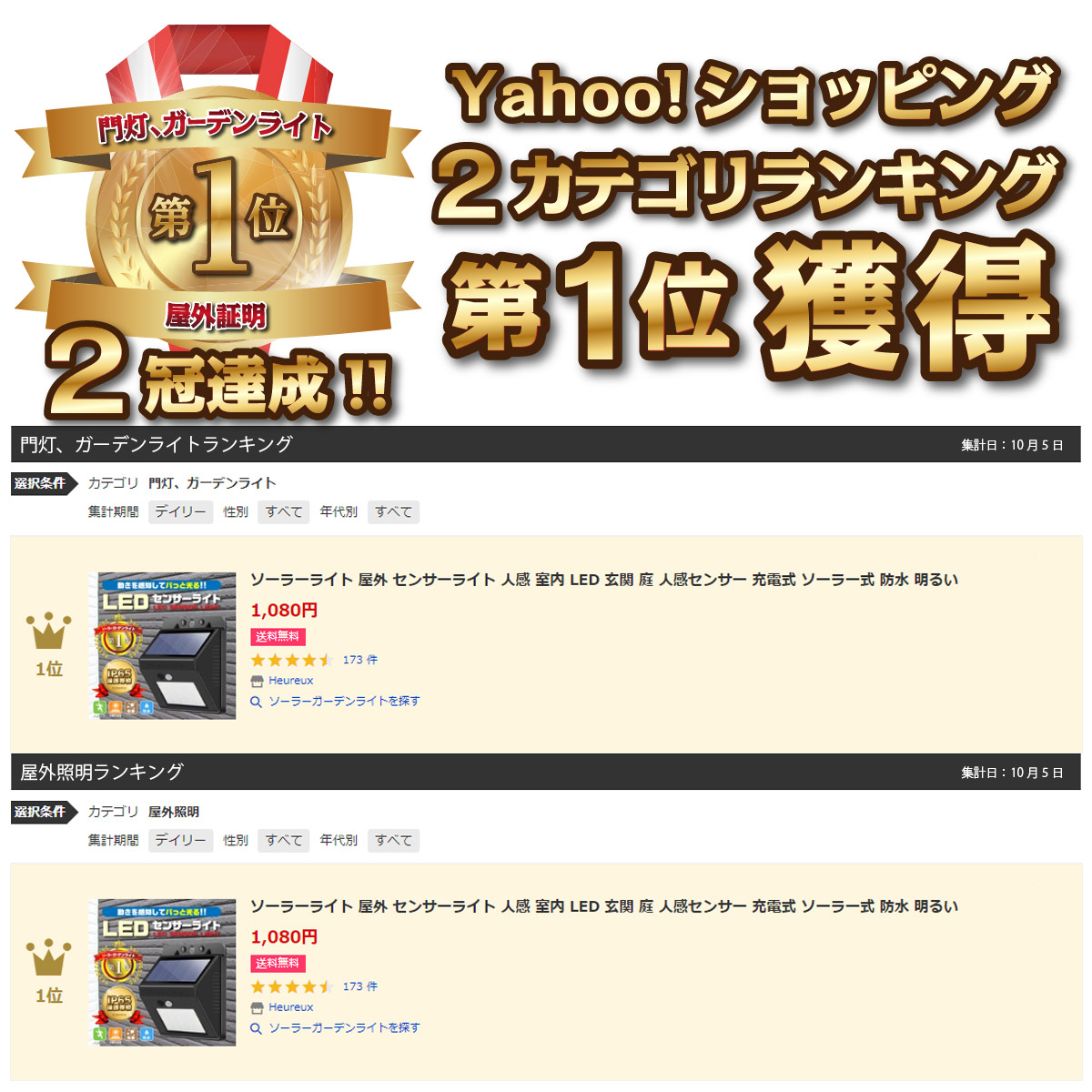 センサー付きのソーラーLEDライト2個セット。