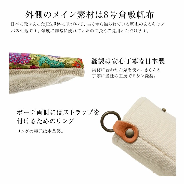 強度・耐久性・通気性にも優れた倉敷帆布と、オシャレなリバティ生地を使用したHIGHCAMPオリジナルポーチです。