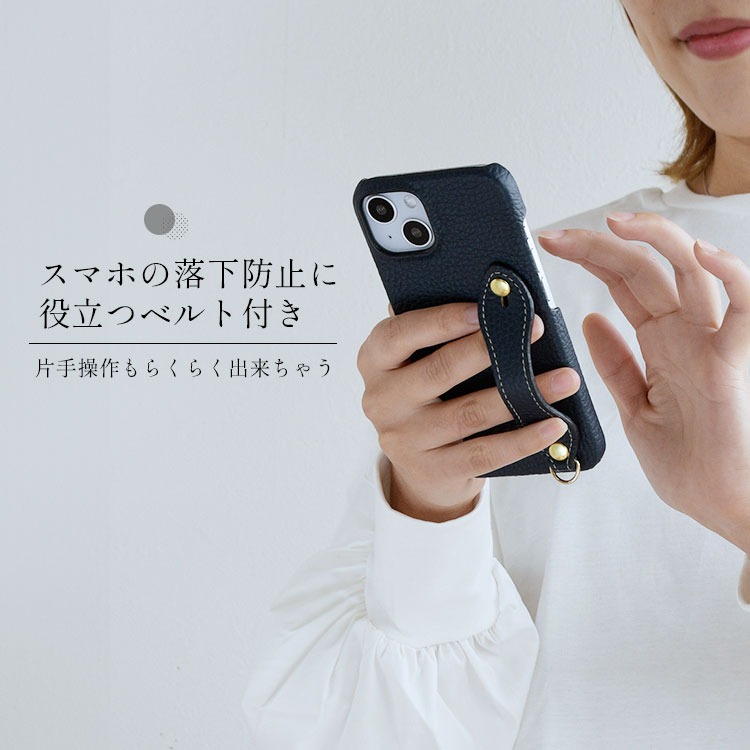全面革貼りベルト付きスマホケースです。ベルトは落下防止に役立つだけでなく、スタンドとしても使用できる便利な2way仕様。