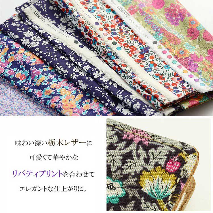 使用している革は栃木レザーです、布部分は花柄がかわいいリバティ生地を使用しています。