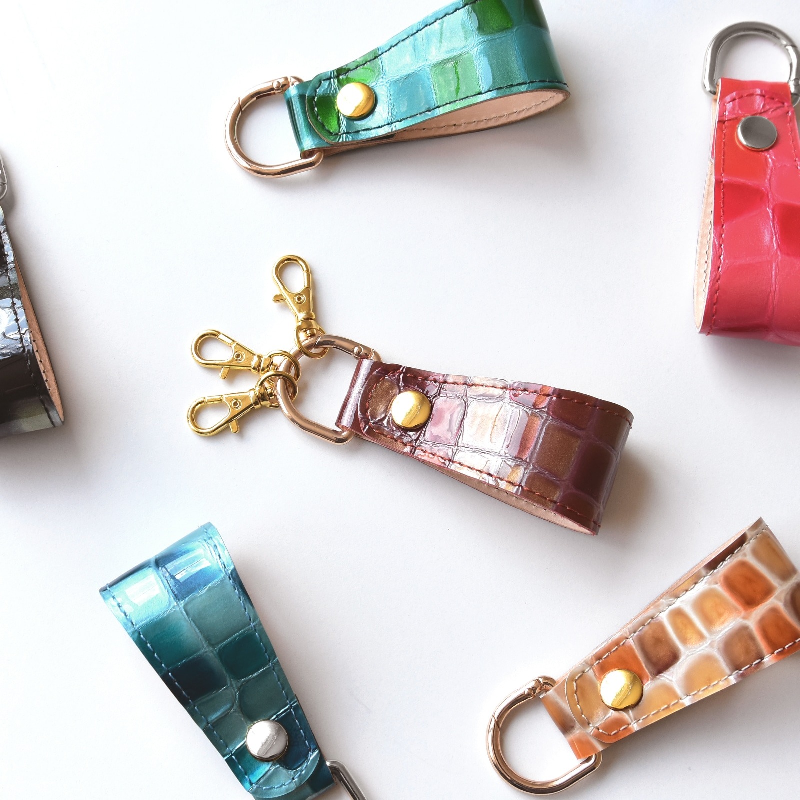 キーリング キーホルダー 本革 ホック付き バッグチャーム ストラップ 落下防止 ベルト ステンドグラスレザー ショートストラップ スマートキー エナメルレザー