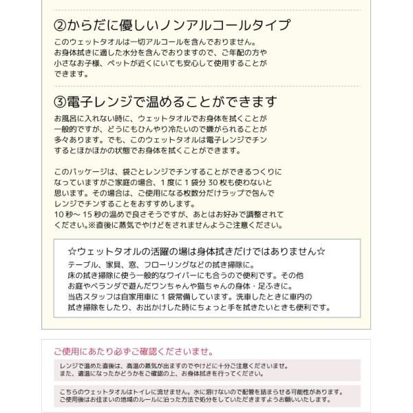 レンジで温めた直後は、高温の蒸気が出ますのでやけどに十分ご注意くださいませ。また、適温になったかどうかをご確認の上、お身体拭きを行ってください。