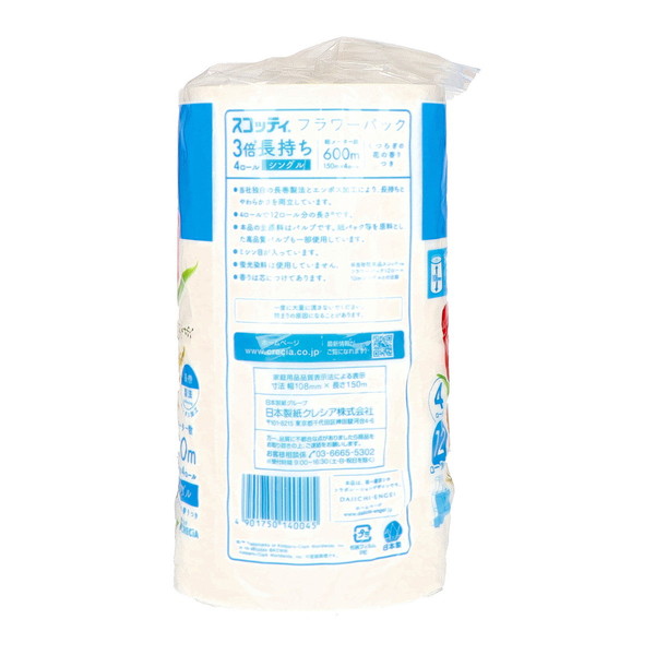 日本製紙クレシアスコッティフラワーパック3倍長持ちトイレットロールシングル150m×4ロールトイレットペーパー (ALTR)