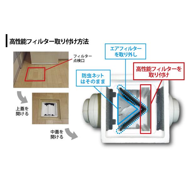 床面に設置されている床下フィルターボックスに標準で装着されている「くの字型のフィルター」を取り外し、代わりに挿入するタイプです。